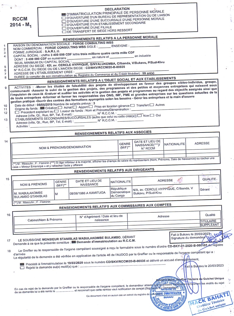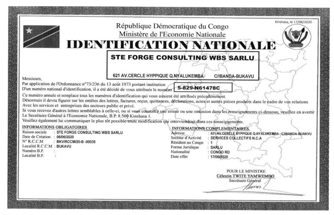 Le siège social de FORGE CONSULTING wbs est situé sur avenue MANIEMA, n°30, Commune d’Ibanda, Ville de Bukavu, dans la province du Sud-Kivu en RD Congo.