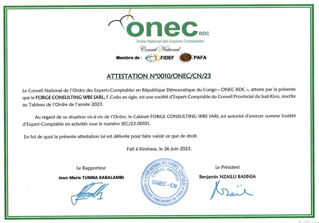 Dirigée par Monsieur WABULAKOMBE BULAMBO Stanislas, Expert-Comptable agréé par ONEC (n°EC/18.00523),Il est rapporteur provincial de l'Ordre National des Experts-comptables du Conseil Provincial du Sud-Kivu. Sur le plan académique, il est detenteur de diplôme de maitrise en comptabilité et gestion financière des organisations, doctorant en Comptabilité Contrôle et Audit de l'université de DSHANG au Cameroun. Un technocrate ayant à son actif plus de 14 ans d’expérience dans les domaines des audits (des ONG, IMF, et entreprises commerciales), appuis fiscal, formation, ingénierie financière et études de faisabilité des projets économique et de développement. Notre équipe est composée des personnes hautement qualifiées, motivées et à l’écoute des besoins de chacun de nos clients.
